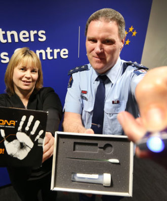 Pictured: BNZ business partner Kirsty McNeill, left, and area commander Inspector Lane Todd test out one of the Selecta DNA kits they will be gifting to Southland schools to keep valuables safe.